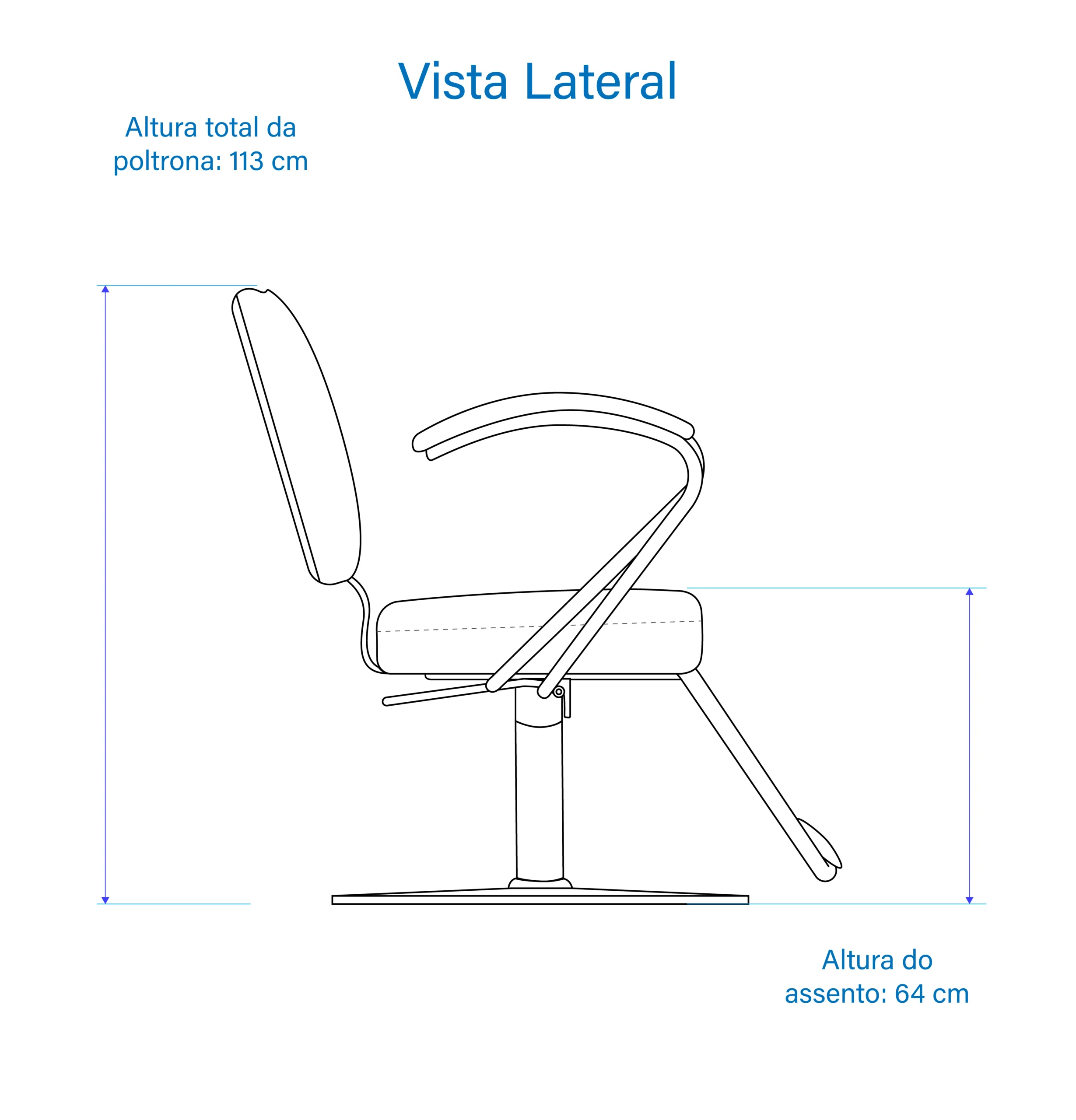 Altura: total máxima 113 cm, total mínima 99 cm, máxima do assento 64 cm, mínima do assento 50 cm;