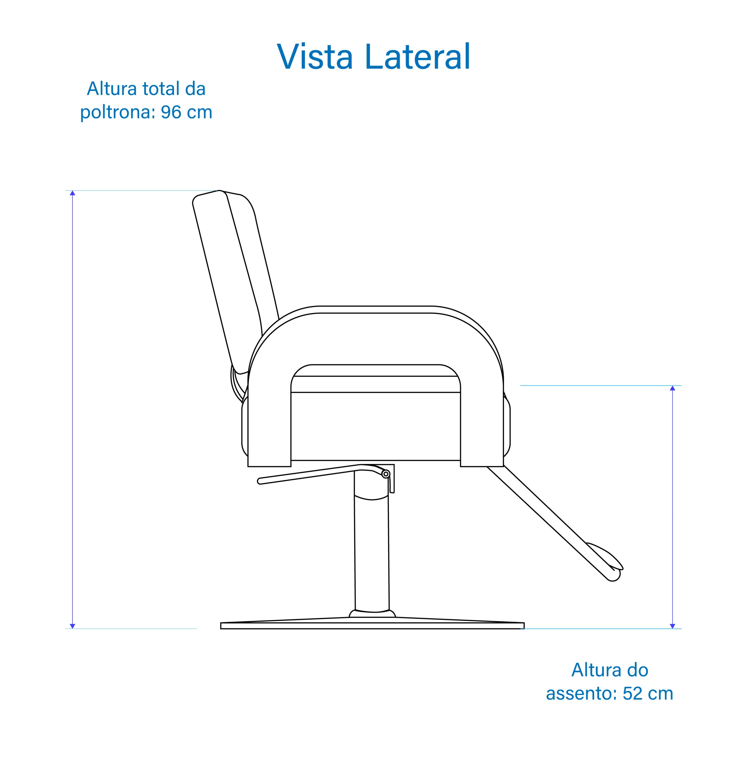 Altura: total máxima 96 cm, total mínima 82 cm, máxima do assento 67 cm, mínima do assento 52 cm;