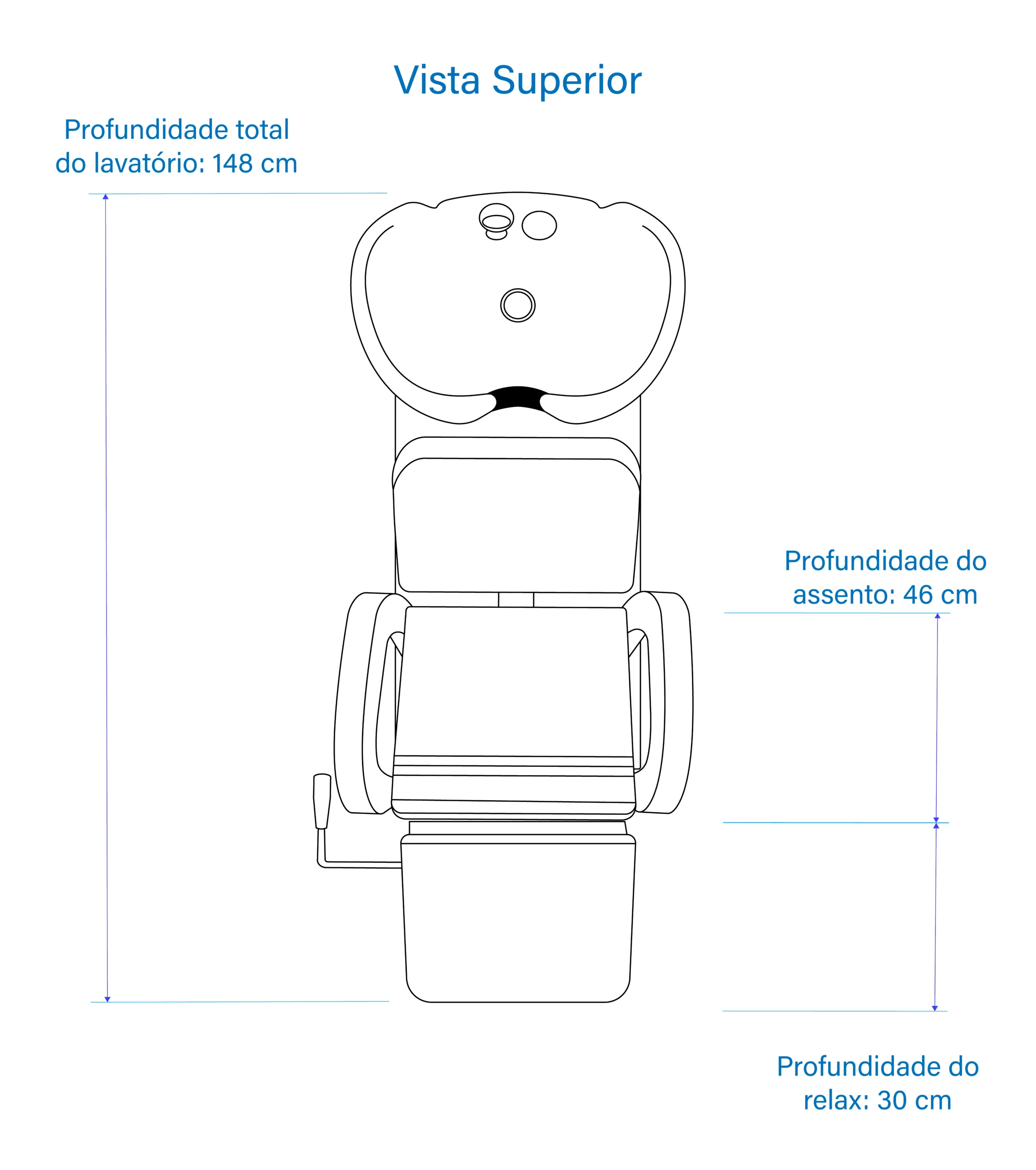 Profundidade do assento: 46 cm; Profundidade total com relax: 148 cm