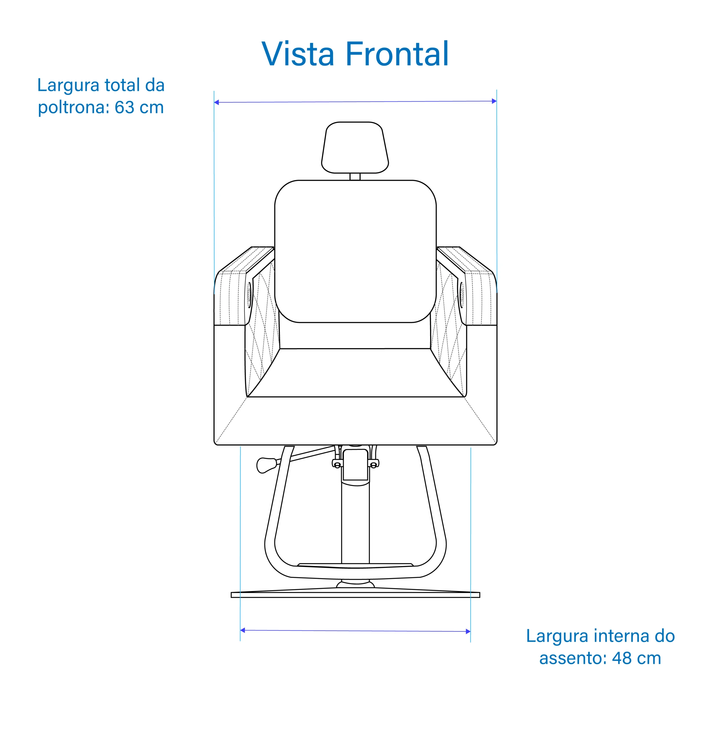 Largura: externa 63 cm, interna do assento 48 cm;