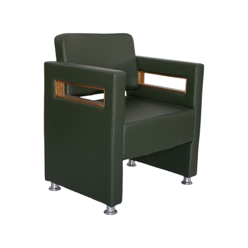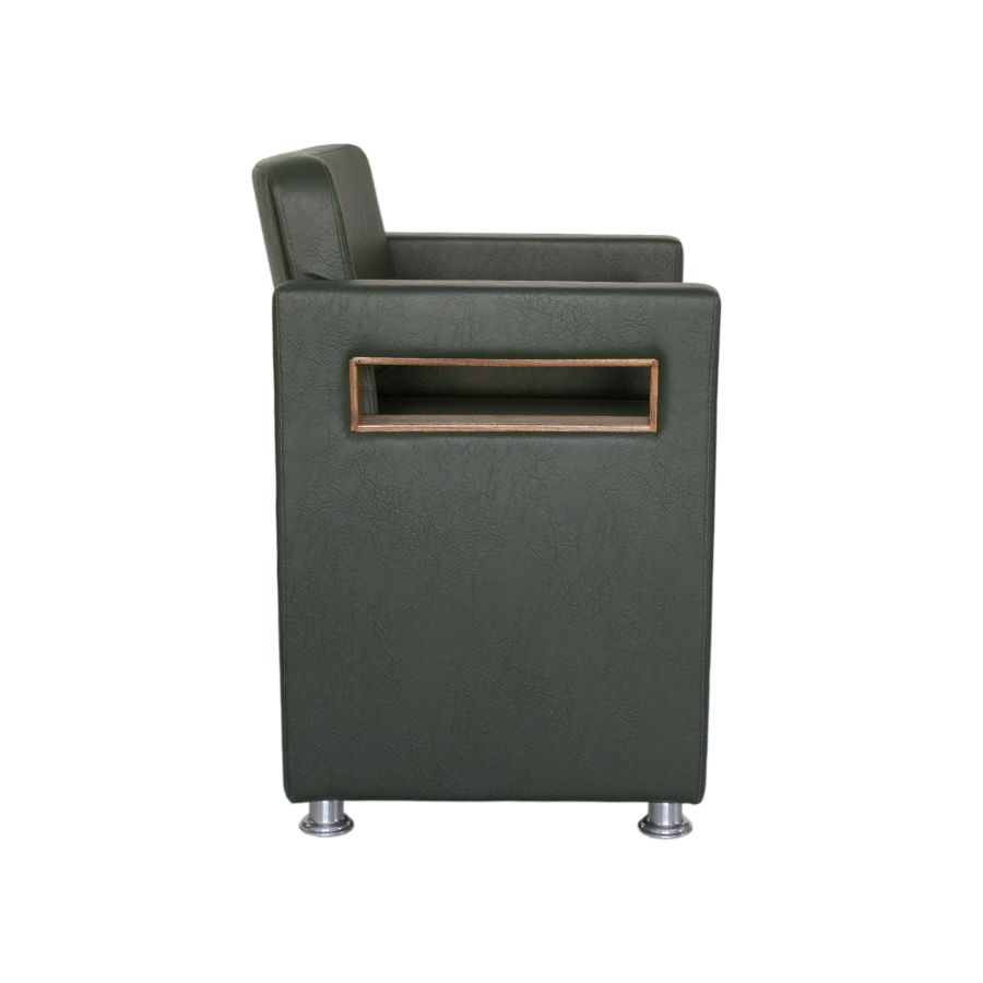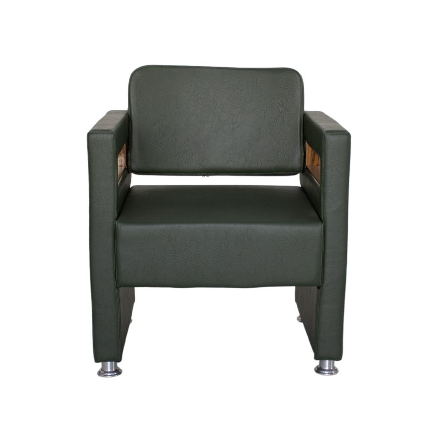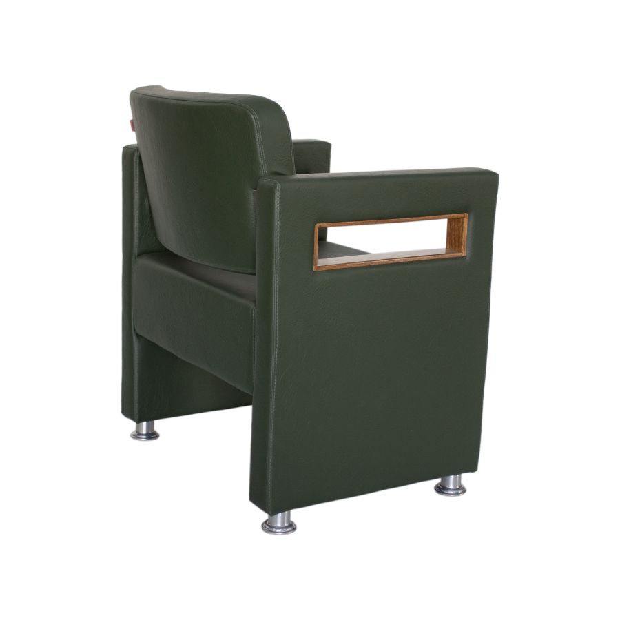 Poltrona: Estruturada em madeira de reflorestamento certificada, estofada em espuma de alta densidade com revestimento em material sintético resistente.